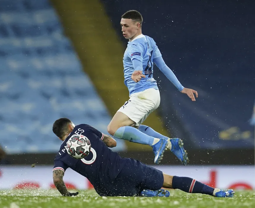 PSG's Leandro Paredes, left, challenges Manchester City's Phil Foden during the Champions League semifinal second leg soccer match between Manchester City and Paris Saint Germain at the Etihad stadium, in Manchester, Tuesday, May 4, 2021. (AP Photo/Dave Thompson)