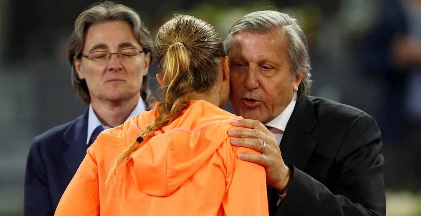 Ilie Nastase of Romania kisses Kristina Mladenovic at the Mutua Madrid Open, Madrid, Spain on Saturday, May 13th, 2017