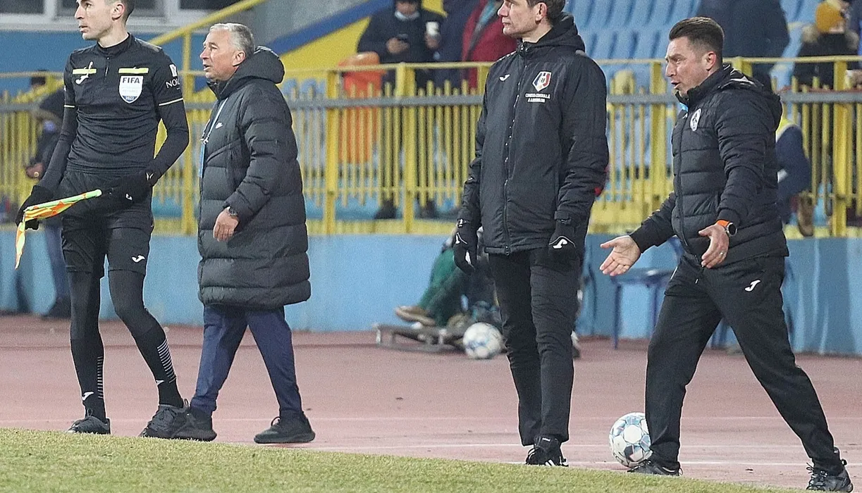 Dan Petrescu si Ilie Poenaru in meciul de fotbal dintre Gaz Metan Medias si CFR Cluj, contand pentru Liga 1 Casa Pariurilor, desfasurat pe Stadionul Municipal din Medias, sambata 12 februarie 2022. © FOTO:Macrea Valentin/SPORT PICTURES