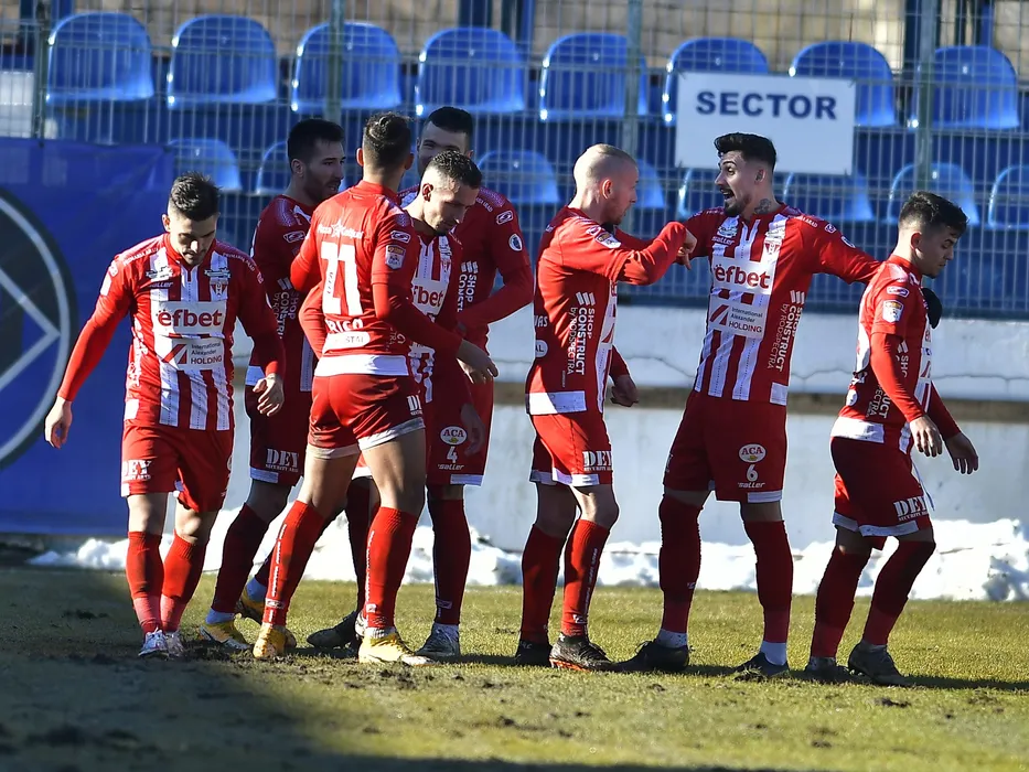 Bucurie a fotbalistilor aradeni dupa un gol marcat cu Simo Roumpoulakou, Valentin Buhacianu, Roger Junio Rodrigues Figueira, Evgenii Shliakov, Alexandru Cristian Albu si Denis Alex Rusu in meciul de fotbal dintre Academica Clinceni si UTA Arad, contand pentru Liga 1 Casa Pariurilor, desfasurat pe Clinceni Arena din Clinceni, joi 4 februarie 2021. © FOTO:Razvan Pasarica/SPORT PICTURES