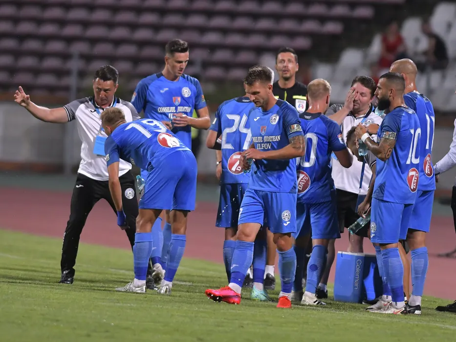 Ilie Poenaru alaturi de fotbalistii din Clinceni printre care Florin Gardos, Floriano Vanzo si Donatas Kazlauskas la o pauza de hidratare in meciul de fotbal dintre Dinamo Bucuresti si Academica Clinceni, contand pentru Liga 1 Casa Pariurilor, desfasurat pe Stadionul Dinamo din Bucuresti, luni 2 august 2021. © FOTO:Razvan Pasarica/SPORT PICTURES