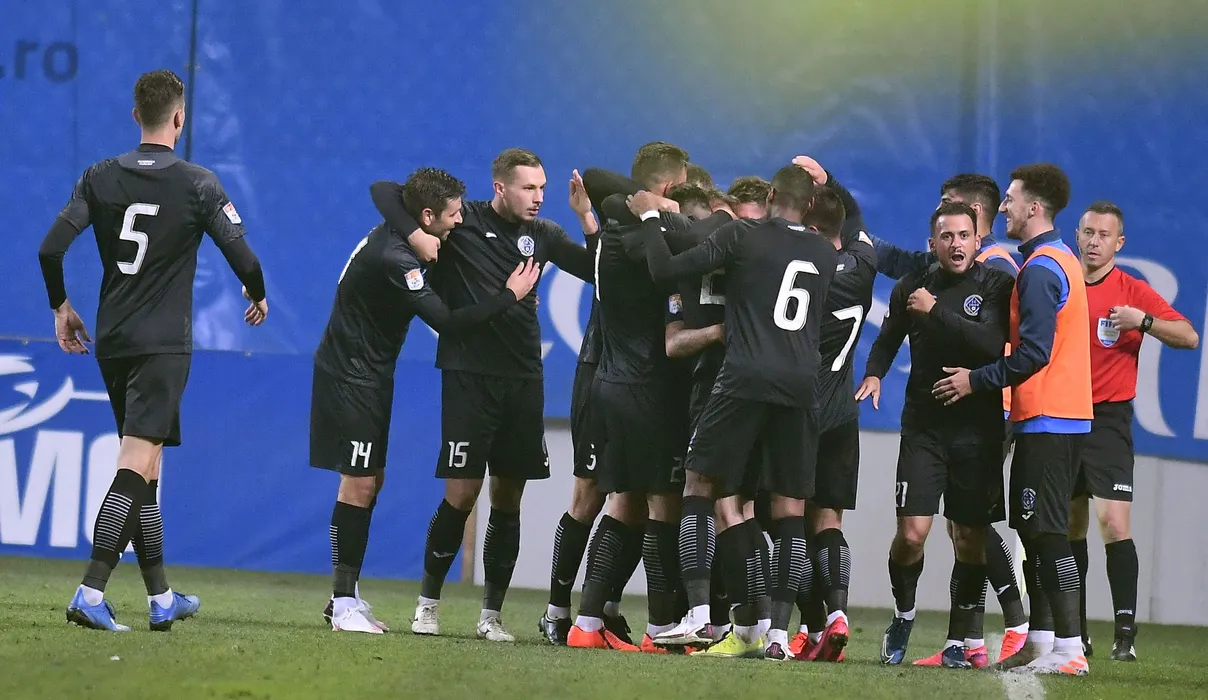 Bucurie a fotbalistilor din Clinceni cu Raul Andrei Rusescu, Mladen Jutric si Mihai Dobrescu dupa un gol marcat in meciul de fotbal dintre Universitatea Craiova si Academica Clinceni, contand pentru Liga 1 Casa Pariurilor, desfasurat fara spectatori pe Stadionul Ion Oblemenco din Craiova, vineri 23 octombrie 2020. © FOTO:Razvan Pasarica/SPORT PICTURES