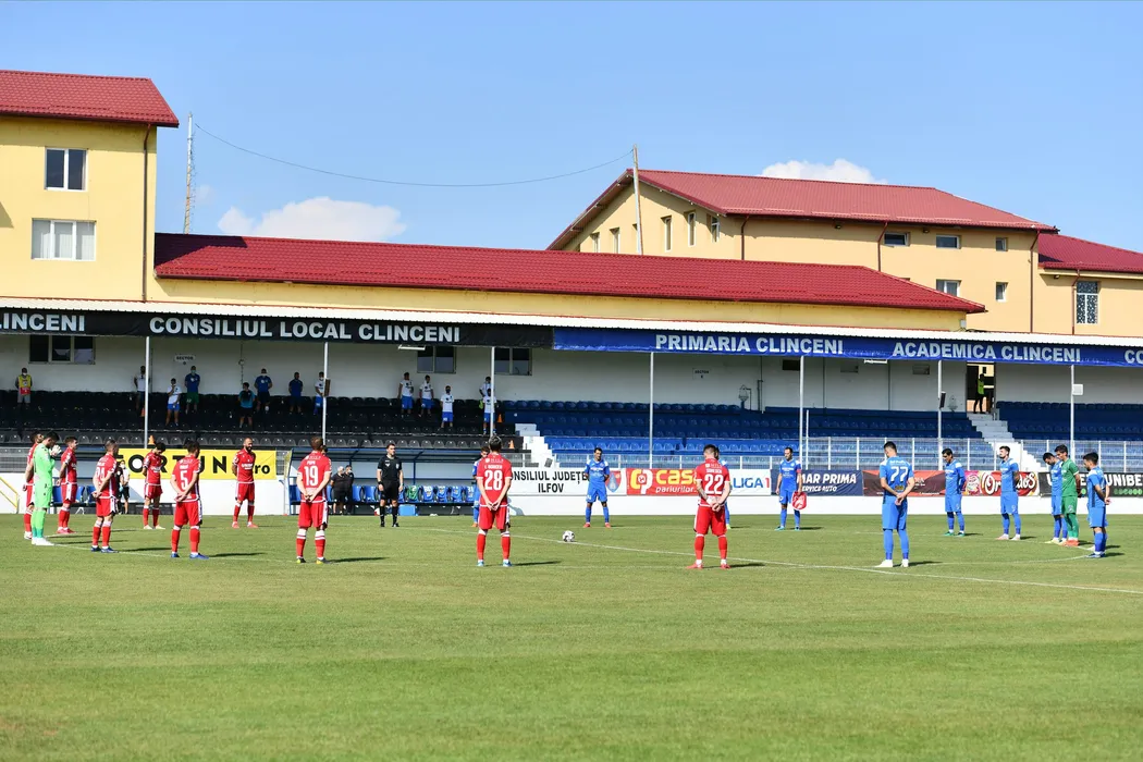 Jucatorii celor doua echipe tin un minut de reculegere in meciul de fotbal dintre Academica Clinceni si Dinamo Bucuresti, contand pentru play-out-ul Ligii 1 Casa Pariurilor, disputat pe Clinceni Arena din Clinceni, duminica 5 iulie 2020. © FOTO:Razvan Pasarica/SPORT PICTURES
