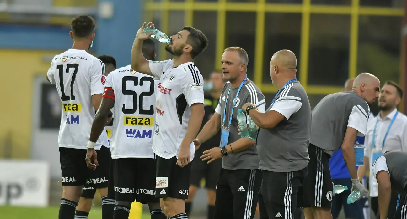 Erik Augustin Lincar reactioneaza alaturi de fotbalistii clujeni printre care Adrian Ionut Balan aflati la o pauza de hidmratare avuta in meciul de fotbal dintre Universitatea Cluj si Petrolul Ploiesti, contand pentru Superliga Superbet, desfasurat pe stadionul Municipal din Medias, vineri 5 august 2022. © FOTO:Razvan Pasarica/SPORT PICTURES