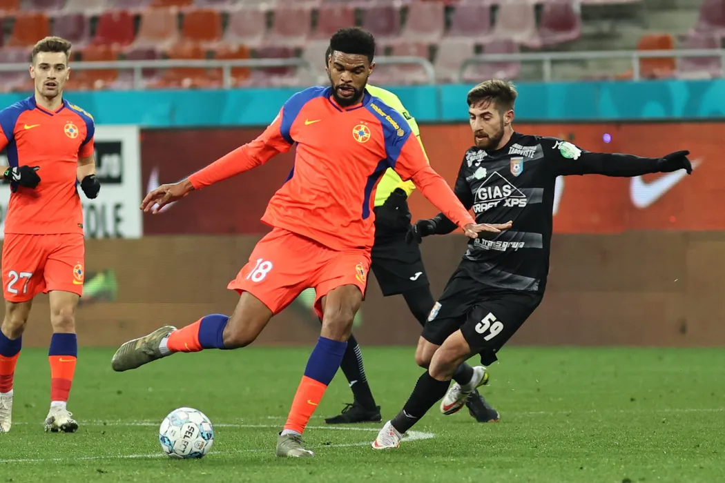 Malcom Edjouma (S), de la FCSB, lupta pentru balon cu Doru Popadiuc (D), de la Chindia Targoviste, in meciul de fotbal din etapa a XXVI-a a Ligii 1, disputat pe Arena Nationala din Bucuresti, duminica, 13 februarie 2022. GEORGE FILIP / MEDIAFAX FOTO