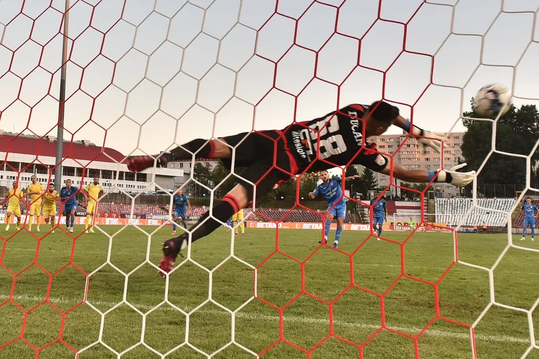 Razvan Cristian Ducan apara un penalty executat de catre Juan Bautista Cascini in meciul de fotbal dintre Academica Clinceni si CS Mioveni, contand pentru Liga 1 Casa Pariurilor, desfasurat pe Stadionul Dinamo din Bucuresti, luni 30 august 2021. © FOTO:Razvan Pasarica/SPORT PICTURES