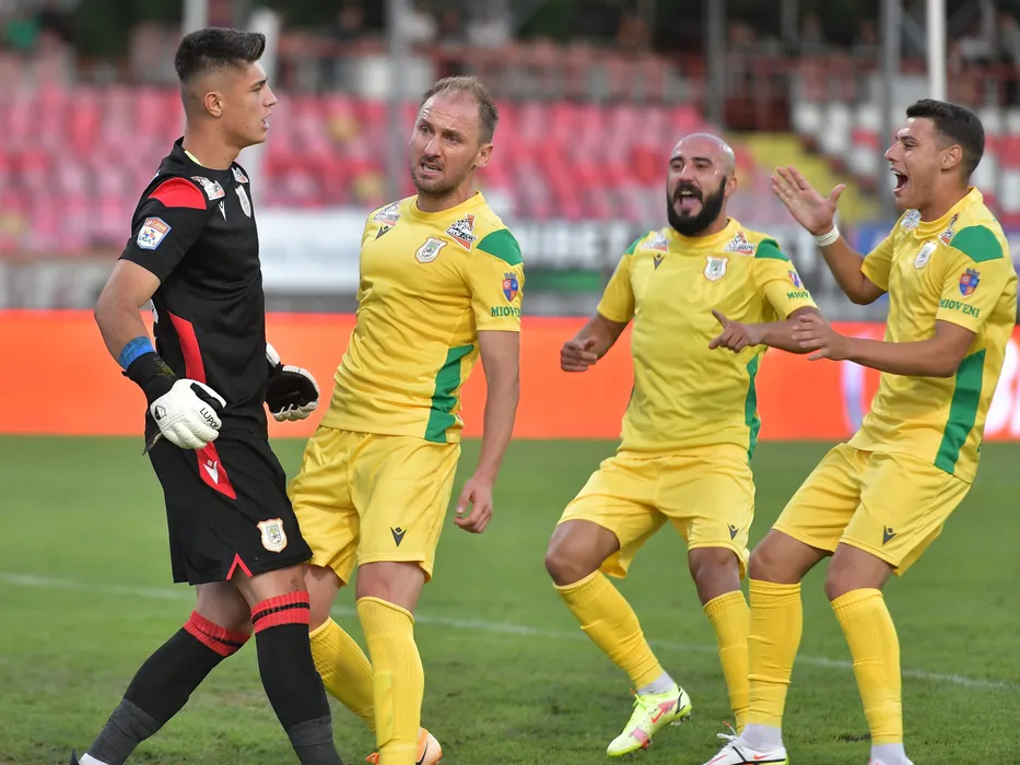 Razvan Cristian Ducan este felicitat de catre Fotbalistii din Mioveni Manuel Adrian Scarlatache, Daniel Marius Serbanicasi Mihai Andrei Panait dupa un penalty aparat in meciul de fotbal dintre Academica Clinceni si CS Mioveni, contand pentru Liga 1 Casa Pariurilor, desfasurat pe Stadionul Dinamo din Bucuresti, luni 30 august 2021. © FOTO:Razvan Pasarica/SPORT PICTURES