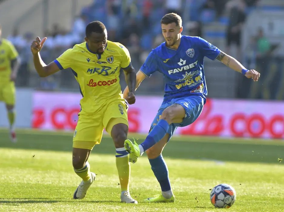 Okechukwu Christian Irobiso si Grigore Ioan Turda in meciul de fotbal dintre FC Petrolul Ploiesti si Gloria Buzau, contand pentru SuperLiga Superbet - Play-out, desfasurat pe Stadionul Ilie Oana din Ploiesti, luni 21 aprilie 2025. © FOTO: Cristi Stavri/SPORT PICTURES