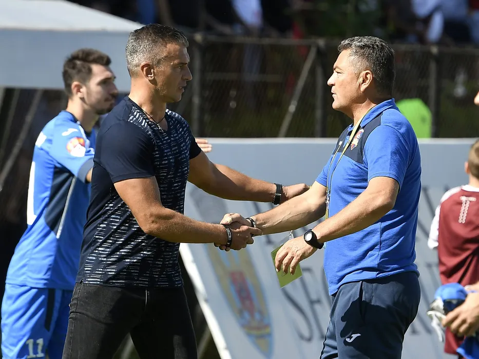 Antrenorii Daniel Pancu si Ilie Stan se saluta dupa meciul de fotbal dintre Rapid Bucuresti si Gloria Buzau, contand pentru Liga a-2-a Casa Pariurilor, desfasurat pe Stadionul Regie-Sportul Studentesc din Bucuresti, duminica 22 septembrie 2019. © FOTO:Razvan Pasarica/SPORT PICTURES