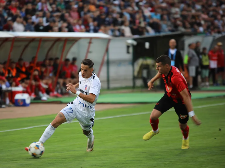 George Alexandru Campanu si János Ferenczi in meciul de fotbal dintre FC Botosani si FK Csikszereda Miercurea Ciuc, contand pentru Superliga Superbet, desfasurat pe Stadionul Municipal din Botosani, sambata 23 august august 2025. © FOTO:Ionut Tabultoc/SPORT PICTURES