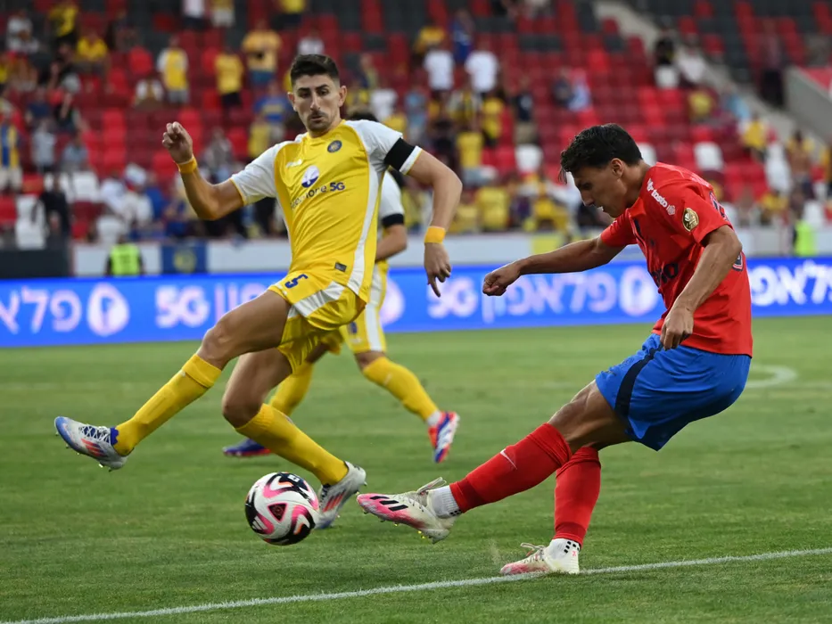 Idan Nachmias si Risto Radunovic in meciul dintre Maccabi Tel Aviv FC si FCSB, contand pentru Preliminariile Ligii Campionilor, desfasurat pe Bozsik Arena din Budapesta, miercuri 31 iulie 2024. © FOTO:Razvan Pasarica/SPORT PICTURES