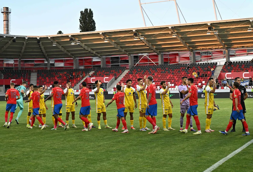 Fotbalistii celor doua echipe se saluta inaintea meciului dintre Maccabi Tel Aviv FC si FCSB, contand pentru Preliminariile Ligii Campionilor, desfasurat pe Bozsik Arena din Budapesta, miercuri 31 iulie 2024. © FOTO:Razvan Pasarica/SPORT PICTURES
