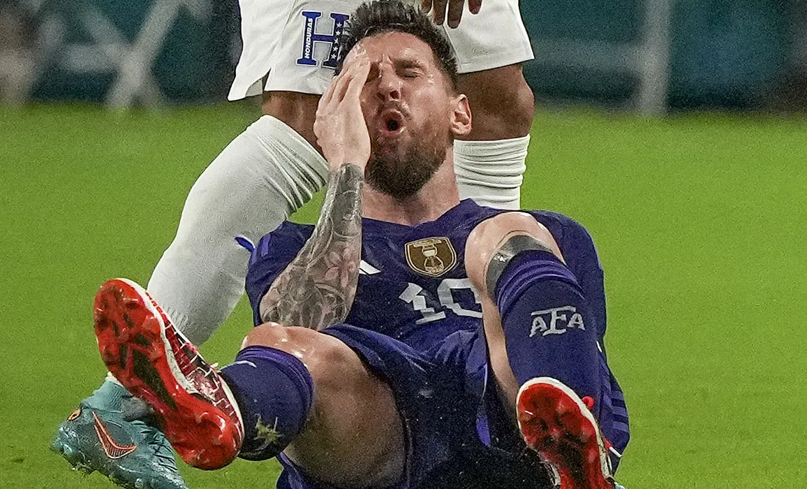 MIAMI GARDENS, FLORIDA - SEPTEMBER 23: Midfielder Deybi Aldair Flores Flores #20 of Honduras fouls Forward Lionel Messi #10 of Argentina during the first half of the international friendly match between Honduras and Argentina at Hard Rock Stadium on September 23, 2022 in Miami Gardens, Florida. (Photo by Eric Espada/Getty Images)