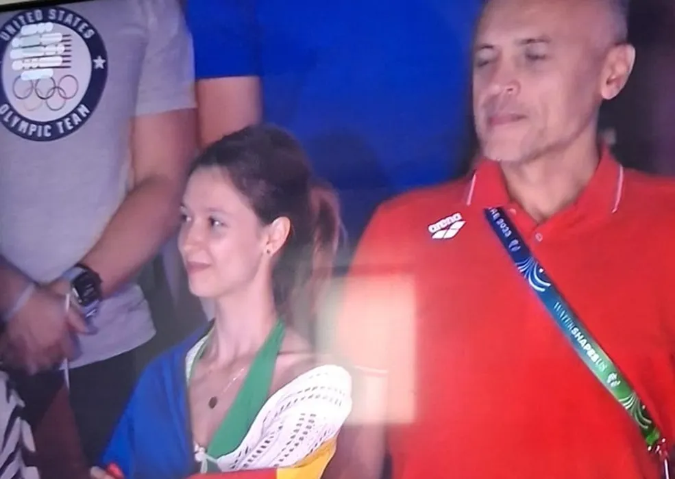 Imaginea fericirii! Iubita lui David Popovici, înfășurată în steagul României, s-a bucurat pentru medalia de aur de la 100 m lângă tatăl campionului mondial