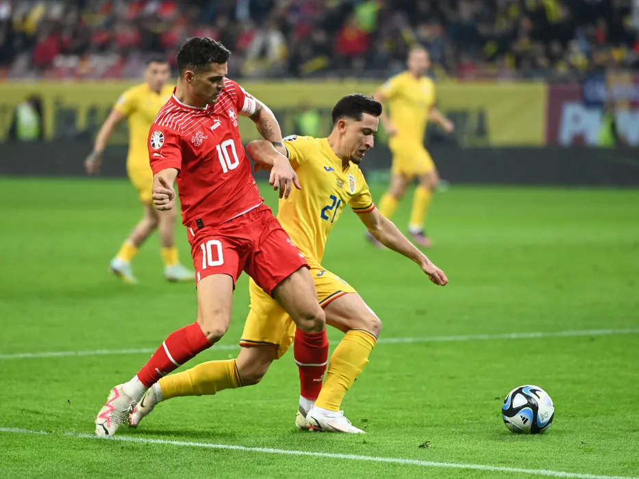 Granit Xhaka si Olimpiu Morutan in meciul de fotbal dintre Romania si Elvetia, din cadrul preliminariilor Campionatului European 2024, desfasurat pe Arena Nationala, marti 21 noiembrie 2023. © FOTO:Razvan Pasarica/SPORT PICTURES