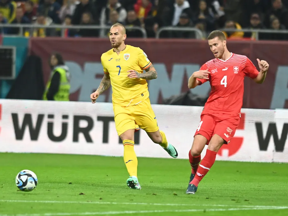 Denis Alibec si Nico Elvedi in meciul de fotbal dintre Romania si Elvetia, din cadrul preliminariilor Campionatului European 2024, desfasurat pe Arena Nationala, marti 21 noiembrie 2023. © FOTO:Razvan Pasarica/SPORT PICTURES