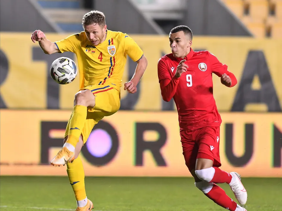 Bogdan Mitrea si Max Ebong in meciul de fotbal dintre Romania si Belarus, contand pentru Liga Natiunilor, desfasurat fara spectatori pe Stadionul Ilie Oana din Ploiesti, miercuri 11 noiembrie 2020. © FOTO:Razvan Pasarica/SPORT PICTURES