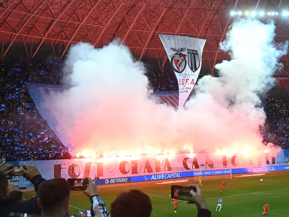 Supercoregrafie craioveana cu trimitere la celebrul meci impotriva Benficai Lisabona disputat in 1983, realizata inaintea meciului de fotbal dintre Universitatea Craiova si FCSB, contand pentru Play-off-ul Superligii Superbet, desfasurat pe Stadionul Ion Oblemenco din Craiova, duminica 30 aprilie 2023. © FOTO:Razvan Pasarica/SPORT PICTURES