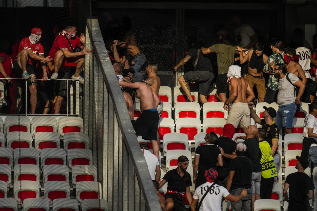 FC Koln supporters, left, clash with Nice supporters prior to the start of the Europa Conference League Group D match between Nice and FC Koln at the Allianz Riviera stadium in Nice, France, Thursday, Sept. 8, 2022. (AP Photo/Daniel Cole)