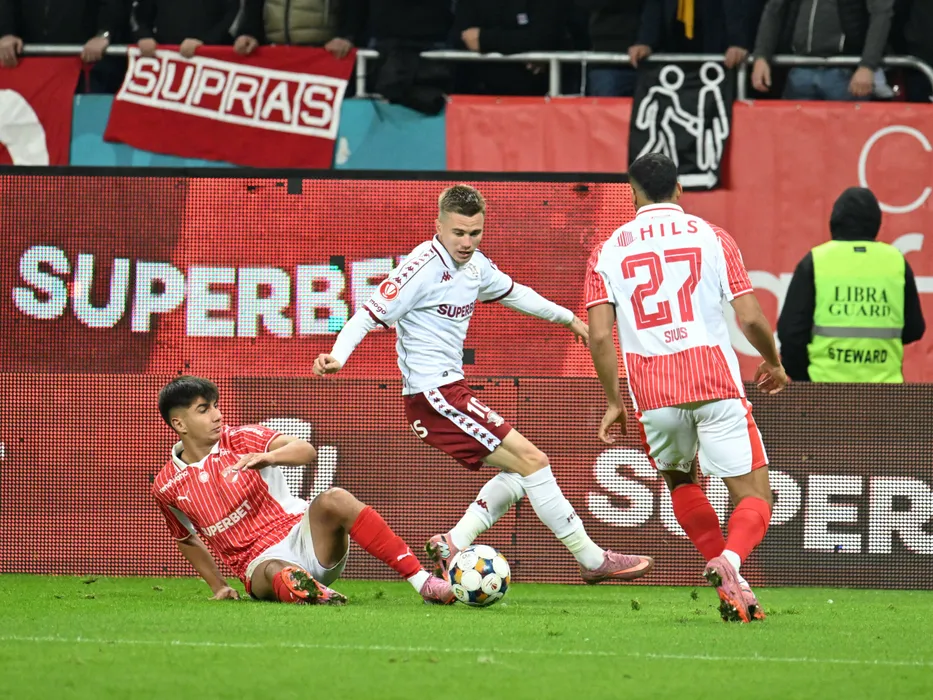 Alexandru Marian Musi si Claudiu Adrian Mihai Petrila in meciul de fotbal dintre Dinamo Bucuresti si Rapid Bucuresti, din cadrul Superligii Superbet, desfasurat pe Arena Nationala din Bucuresti, duminica 19 octombrie 2025. © FOTO:Razvan Pasarica/SPORT PICTURES