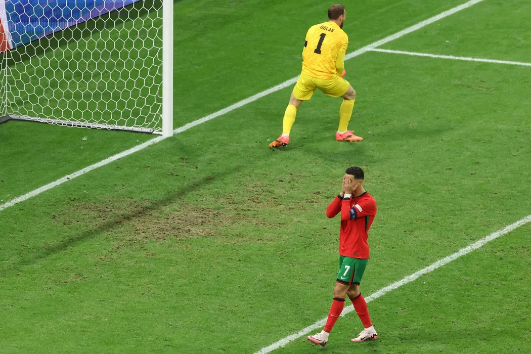 Cristiano Ronaldo of Portugal reacts to missing a penalty kick