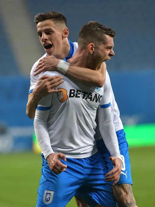 Alexandru Cicaldau se bucura dupa un gol marcat alaturi de Alexandru George Cimpanu in meciul de fotbal dintre Universitatea Craiova si FCSB, contand pentru Play-off-ul Ligii 1 Casa Pariurilor, desfasurat fara spectatori pe Stadionul Ion Oblemenco din Craiova, joi 29 aprilie 2021. © FOTO:Razvan Pasarica/SPORT PICTURES