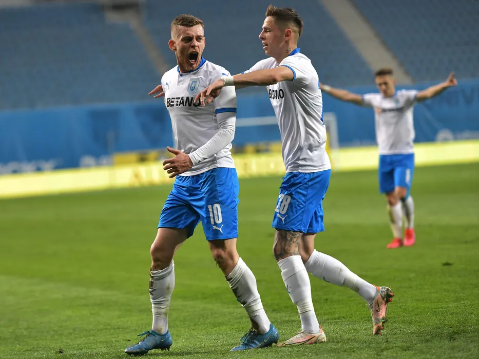 Alexandru Cicaldau se bucura dupa un gol marcat alaturi de Alexandru George Cimpanu in meciul de fotbal dintre Universitatea Craiova si FCSB, contand pentru Play-off-ul Ligii 1 Casa Pariurilor, desfasurat fara spectatori pe Stadionul Ion Oblemenco din Craiova, joi 29 aprilie 2021. © FOTO:Razvan Pasarica/SPORT PICTURES