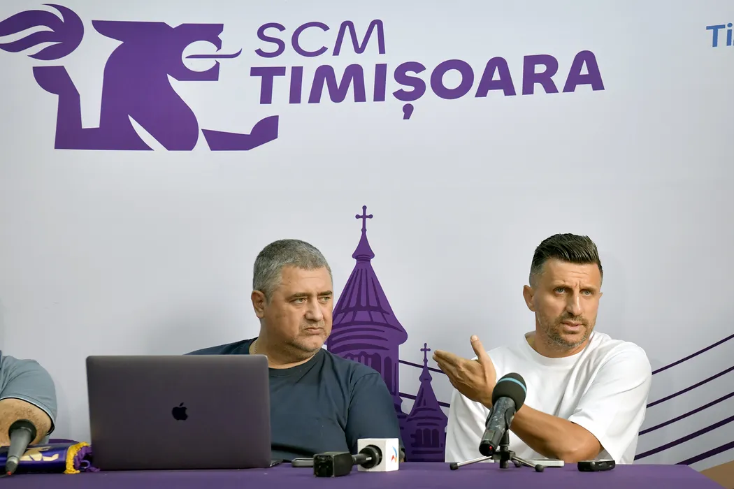 Alexandru Dedu(S), managerul SCM Politehnica Timisoara si George Buricea(D), antrenorul principal al echipei de handbal, participa la o conferinta de presa in Sala Sporturilor ”Constantin Jude” din Timisoara, joi,11 septembrie 2025. George Buricea este antrenorul echipei din 5 iunie 2025 cu un contract semnat pe 2 ani. VALENTINA SAROSI/ MEDIAFAX FOTO
