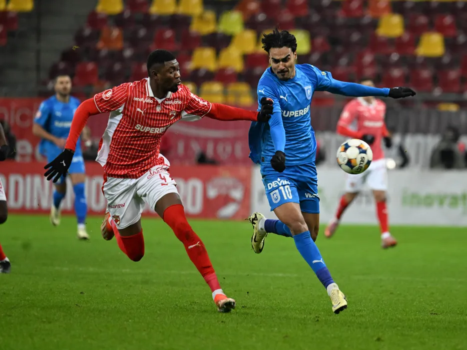 Kennedy Kofi Boateng si Stefan Baiaram in meciul de fotbal dintre Dinamo Bucuresti si Universitatea Craiova, din cadrul Superligii Superbet, desfasurat pe Arena Nationala din Bucuresti, luni 9 februarie 2026. © FOTO:Razvan Pasarica/SPORT PICTURES