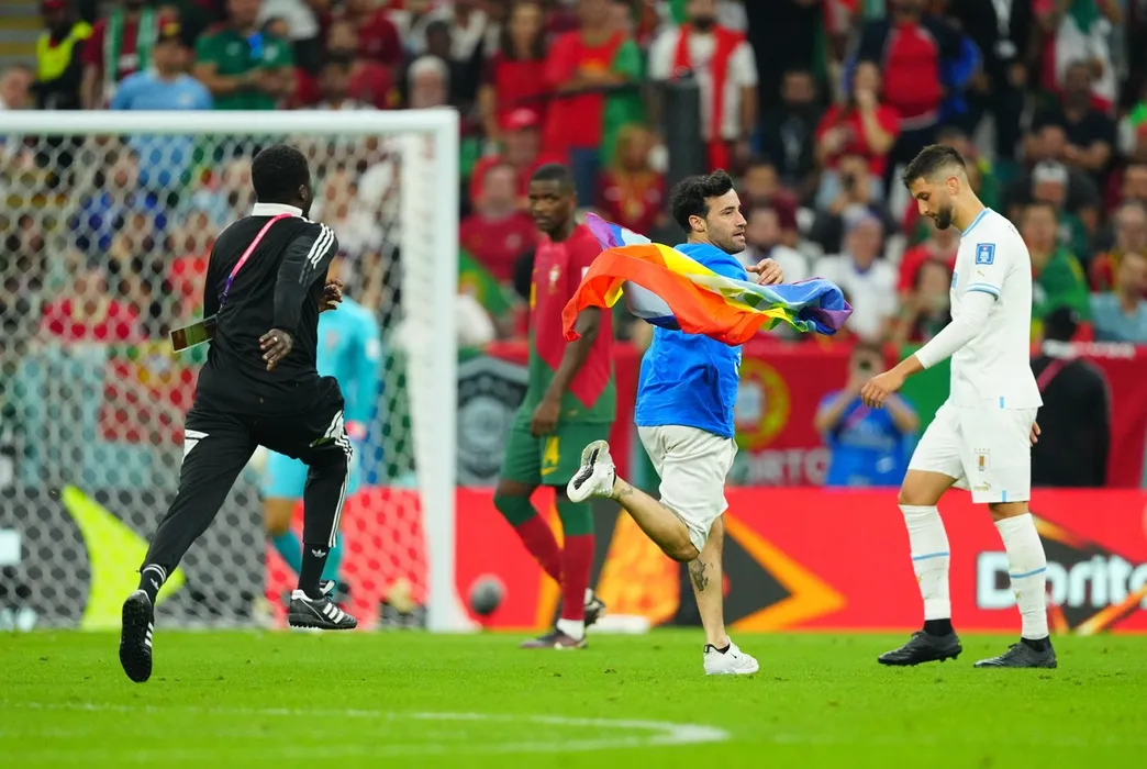 Imagini incredibile în Qatar! Un fan a intrat pe teren la meciul Portugalia – Uruguay cu steagul LGBTQ+, iar acum riscă închisoarea! Ce mesaje a mai transmis | FOTO