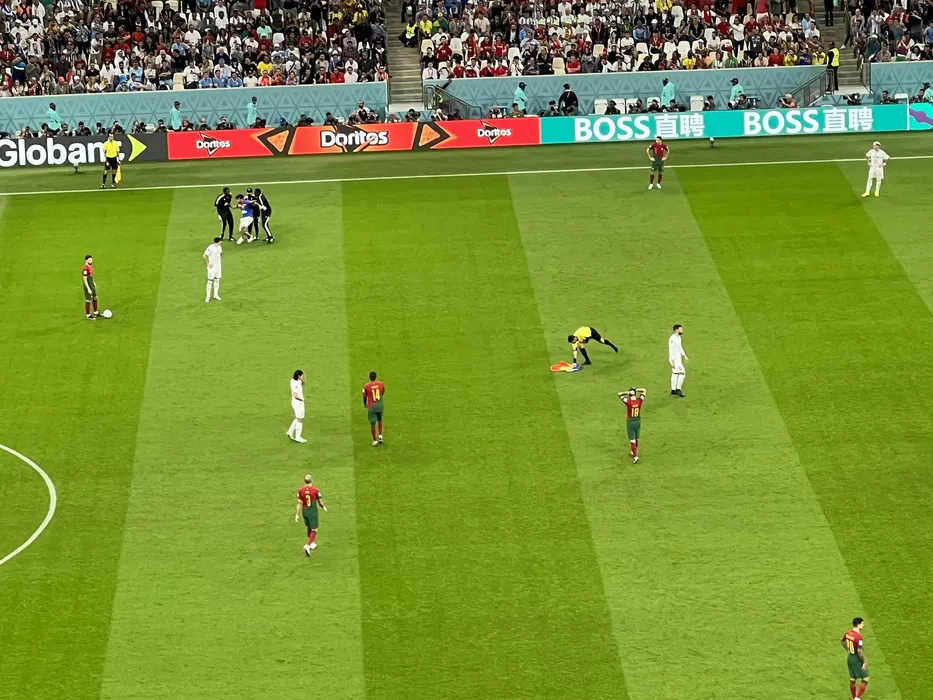 Imagini incredibile în Qatar! Un fan a intrat pe teren la meciul Portugalia – Uruguay cu steagul LGBTQ+, iar acum riscă închisoarea! Ce mesaje a mai transmis | FOTO