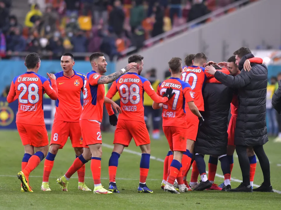 Bucurie a fotbalistilor stelisti dupa un gol marcat cu Adrian Gheorghe Sut, Ovidiu Marian Popescu si Octavian George Popescu in meciul de fotbal dintre FCSB si CFR Cluj, contand pentru Liga 1 Casa Pariurilor, desfasurat pe Arena Nationala din Bucuresti, duminica 23 ianuarie 2022. © FOTO:Razvan Pasarica/SPORT PICTURES