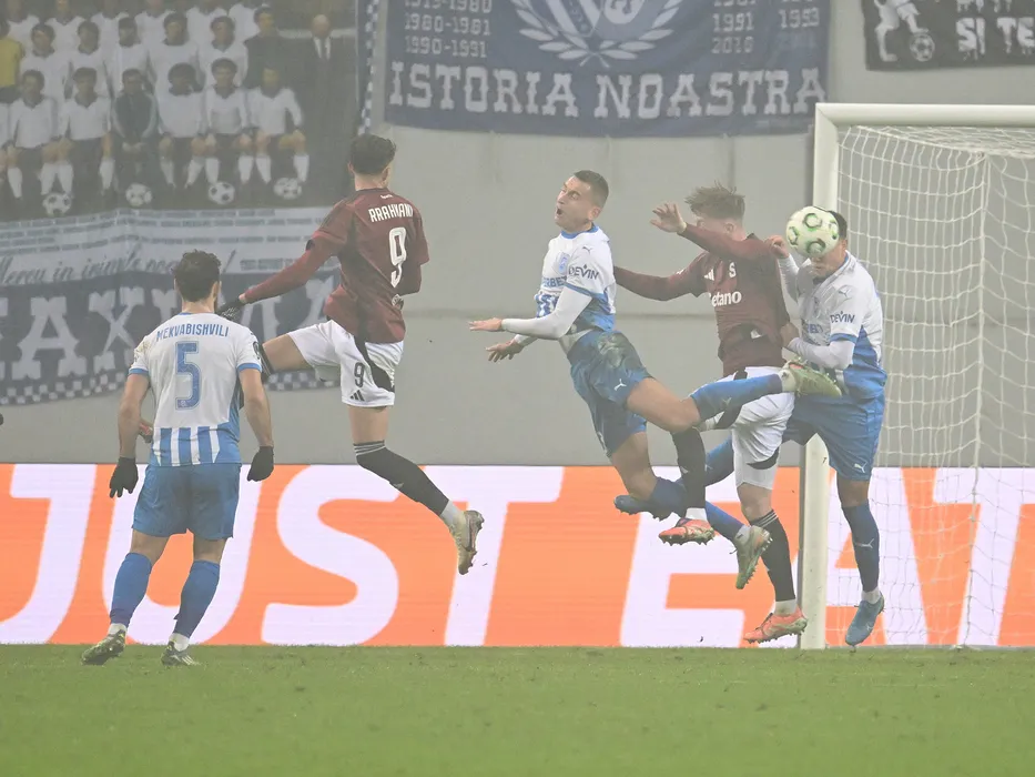 Albion Rrahmani, Oleksandr Romanchuk si Adrian Rus in meciul dintre Universitatea Craiova si Sparta Praga, contand pentru UEFA Conference League, desfasurat pe Stadionul Ion Oblemenco din Craiova, joi 11 decembrie 2025. © FOTO:Razvan Pasarica/SPORT PICTURES
