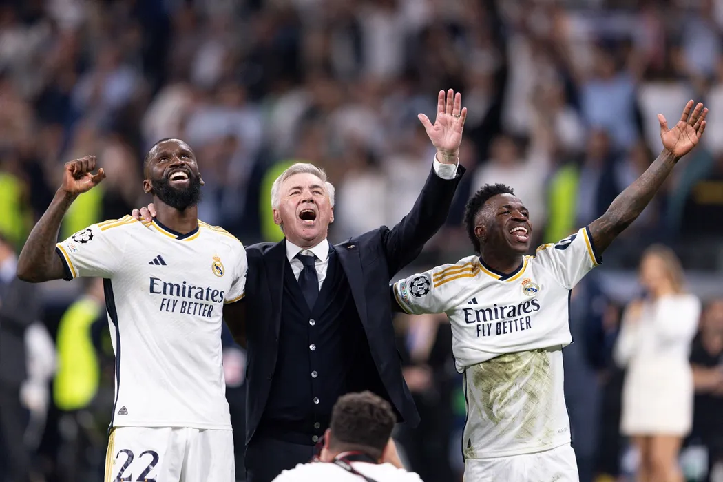 Antonio Rüdiger of Real Madrid (L) and Real Madrid manager Carlo Ancelotti (centre) and Vinícius Júnior of Real Madrid (R) celebrate reaching the Champions League Final at full-time