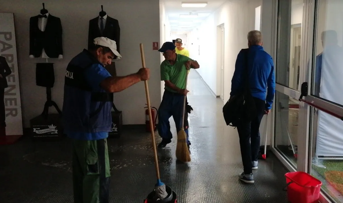 Imaginile zilei vin de la Arad: Ilie Poenaru a pus mâna pe mătură pentru a scoate apa din stadion! FOTO