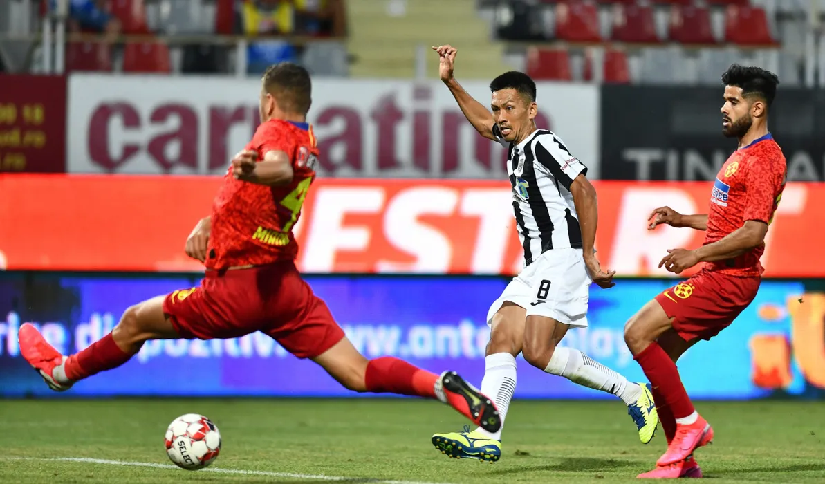 Seto Takayuki marcheaza un gol de langa Ionut Vina si George Andrei Miron in meciul de fotbal dintre Astra Giurgiu si FCSB, contand pentru play-off-ul Ligii 1 Casa Pariurilor, disputat fara spectatori pe Stadionul Marin Anastasovici din Giurgiu, luni 29 iunie 2020. © FOTO:Razvan Pasarica/SPORT PICTURES