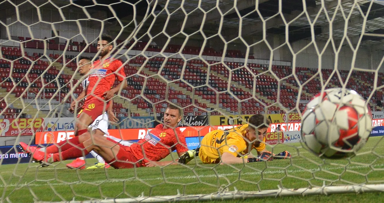 Seto Takayuki marcheaza un gol in poarta lui Andrei Daniel Vlad de langa Ionut Vina si George Andrei Miron in meciul de fotbal dintre Astra Giurgiu si FCSB, contand pentru play-off-ul Ligii 1 Casa Pariurilor, disputat fara spectatori pe Stadionul Marin Anastasovici din Giurgiu, luni 29 iunie 2020. © FOTO:Razvan Pasarica/SPORT PICTURES