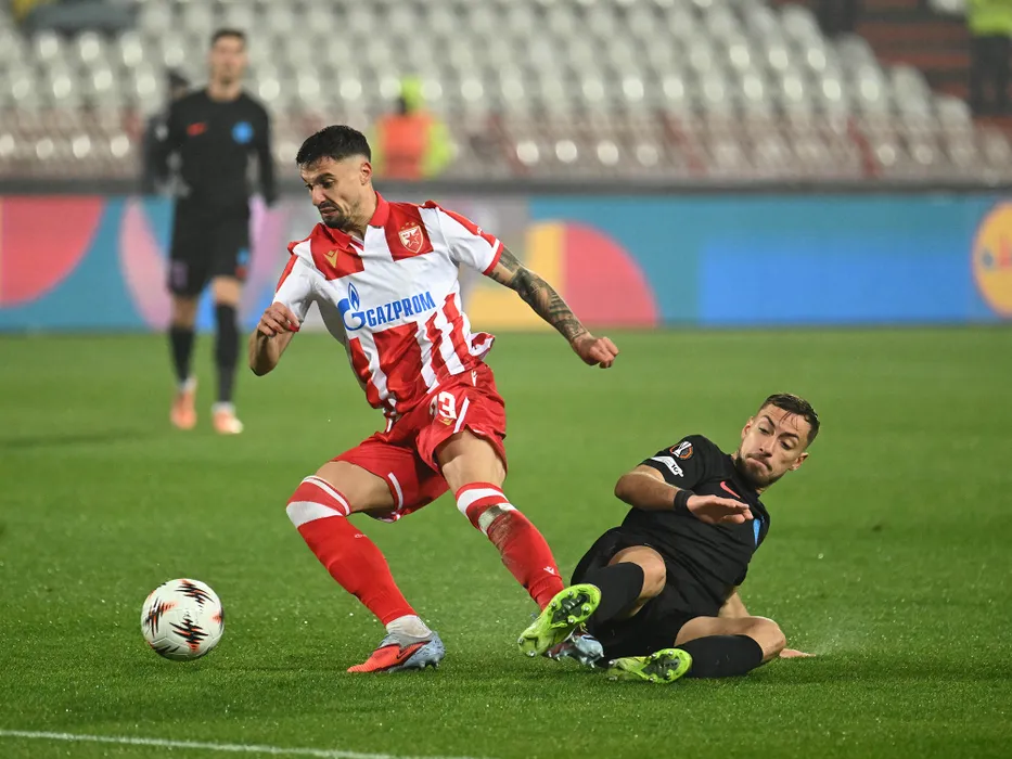 Rade Krunić si Mihai Daniel Lixandru in meciul de fotbal dintre Steaua Rosie Belgrad si FCSB, din cadrul UEFA Europa League, desfasurat pe Stadionul Rajko Mitić din Belgrad, joi 27 noiembrie 2025. © FOTO:Razvan Pasarica/SPORT PICTURES