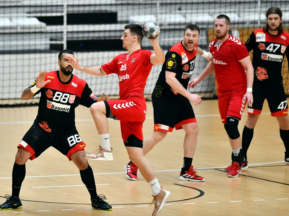 Alireza Mousvi,Dusan Trifkovic si Dan Savenco in meciul de handbal masculin dintre Dinamo Bucuresti si CSM Resita, contand pentru Liga Zimbrilor, disputat in Sala Dinamo din Bucuresti, duminica 16 februarie 2019. © FOTO:Razvan Pasarica/SPORT PICTURES