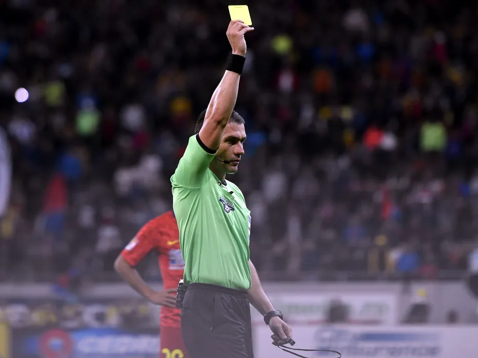 Arbitru central Istvan Kovacs arata un cartonas galben in meciul de fotbal dintre FCSB si Dinamo Bucuresti, din cadrul Ligii 1 Casa Pariurilor, desfasurat pe Arena Nationala din Bucuresti, sambata 5 octombrie 2019. © FOTO:Razvan Pasarica/SPORT PICTURES