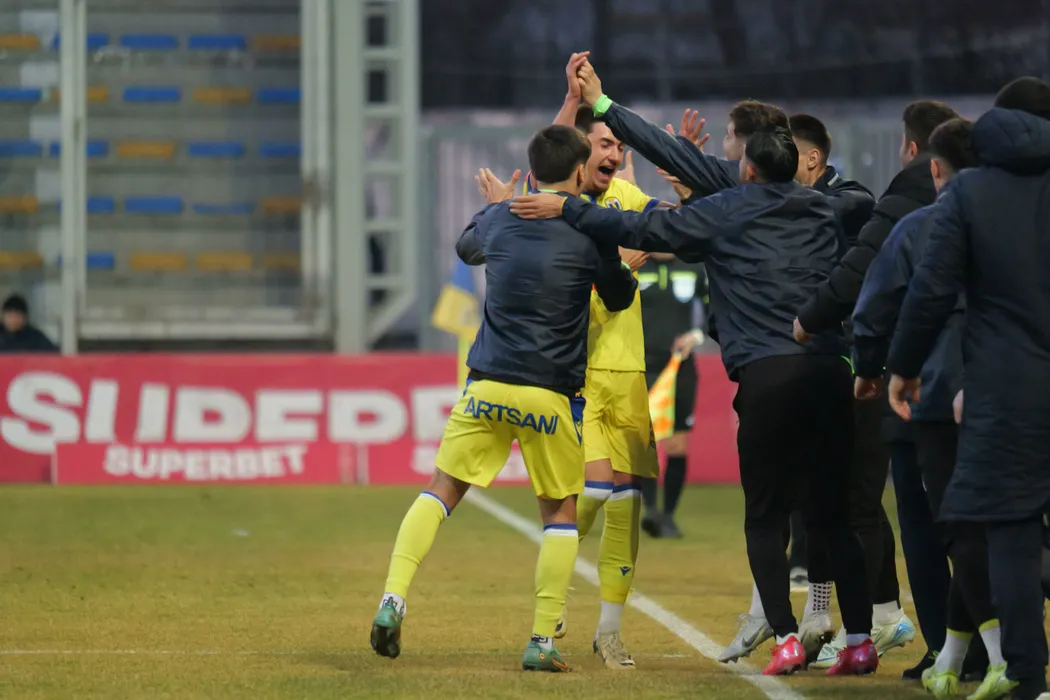 Ioan Catalin Tolea felicitat de coechipierii de pe banca de rezerve dupa un gol marcat in meciul de fotbal dintre Petrolul Ploiesti si FC Botosani, din cadrul Superligii Superbet desfasurat pe Stadionul Ilie Oana din Ploiesti, luni 27 ianuarie 2025. © FOTO:SPORT PICTURES