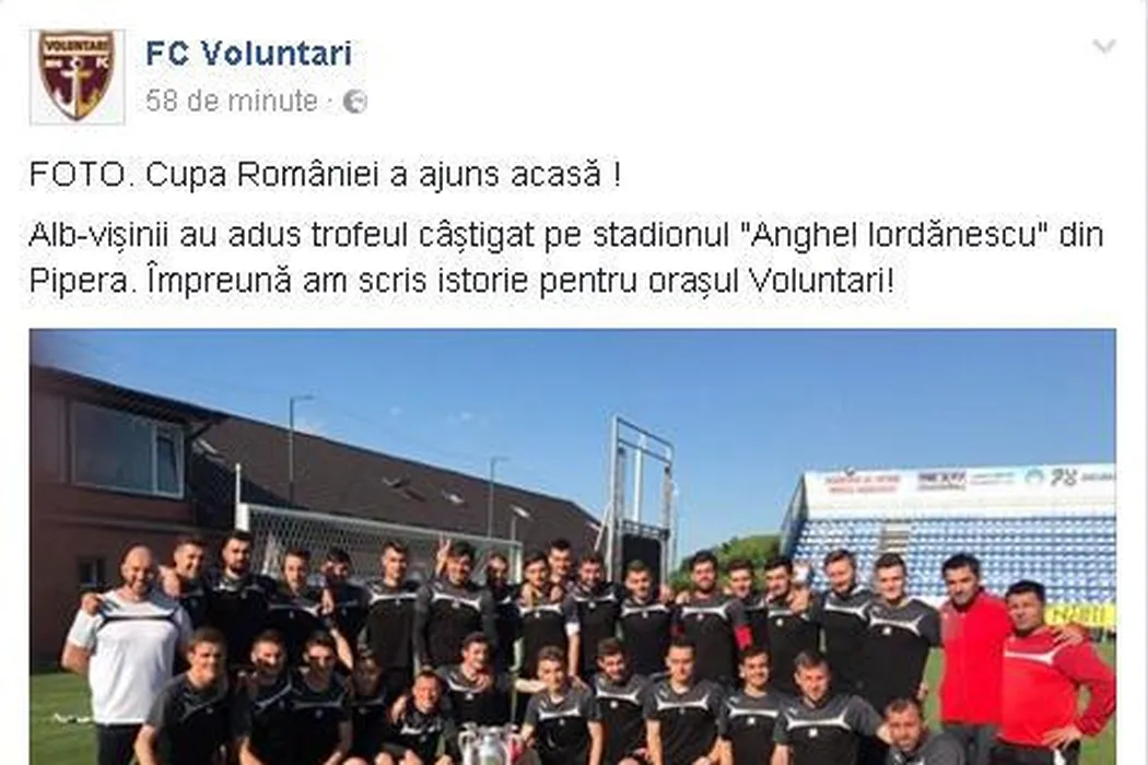 În sfârșit! După câteva zile petrecute cu familia Leasă, Cupa României a ajuns la FC Voluntari. Evenimentul, salutat pe Facebook cum se cuvine: „Alb-vișinii au adus trofeul”