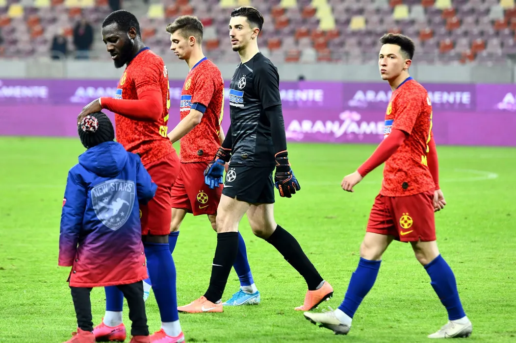 Fotbalistii stelisti Harlem Gnohere,Florin Tanase,Olimpiu Morutan si Andrei Vlad suparati dupa meciul de fotbal dintre FCSB si Chindia Targoviste, contand pentru Liga 1 Casa Pariurilor, disputat pe Arena Nationala din Bucuresti, sambata 22 februarie 2019. © FOTO:Razvan Pasarica/SPORT PICTURES