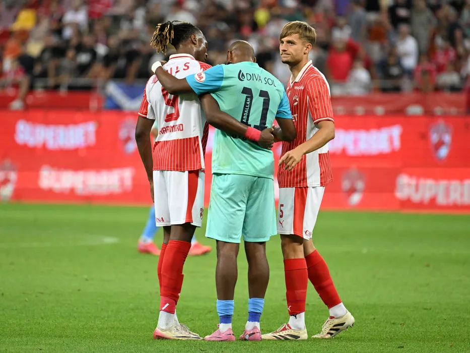 Autorii golurilor Mamoudou Karamoko si Hakim Djamel Abdallah discuta sub privirile lui Razvan Bogdan Pascalau dupa meciul de fotbal dintre Dinamo Bucuresti si UTA Arad, din cadrul Superligii Superbet, desfasurat pe Arena Nationala din Bucuresti, vineri 15 august 2025. © FOTO:Razvan Pasarica/SPORT PICTURES