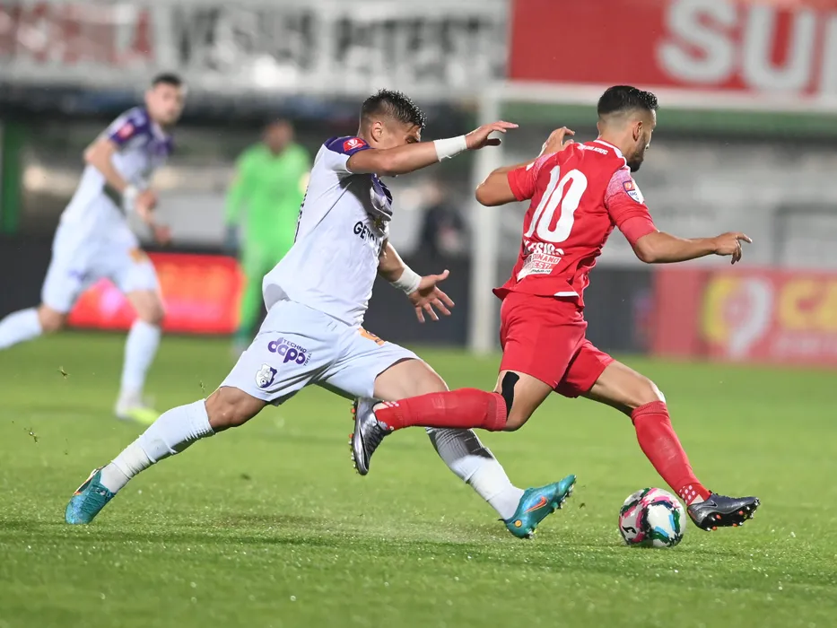 Andrias Cristian Calcan si Daniel Gago Iglesias in meciul de fotbal dintre FC Arges si Dinamo Bucuresti, contand pentru mansa retur a Barajului pentru mentinerea in Superliga Superbet, desfasurat pe Stadionul Orasenesc din Mioveni, sambata 3 iunie 2023. © FOTO:Razvan Pasarica/SPORT PICTURES