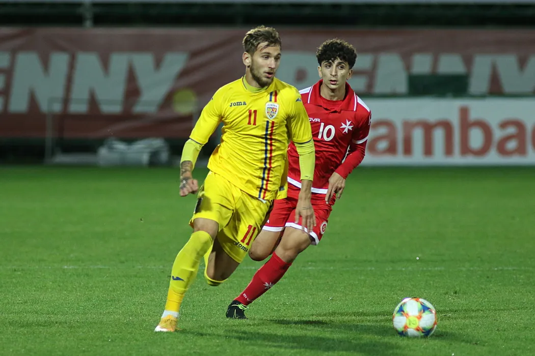 Denis Dragus (S), de la Romania U21, suteaza in timpul meciului de fotbal contra echipei Malta U21 din preliminariile Euro 2021, disputat pe stadionul Marin Anastasovici din Giurgiu, marti, 13 octombrie 2020. GEORGE FILIP / MEDIAFAX FOTO