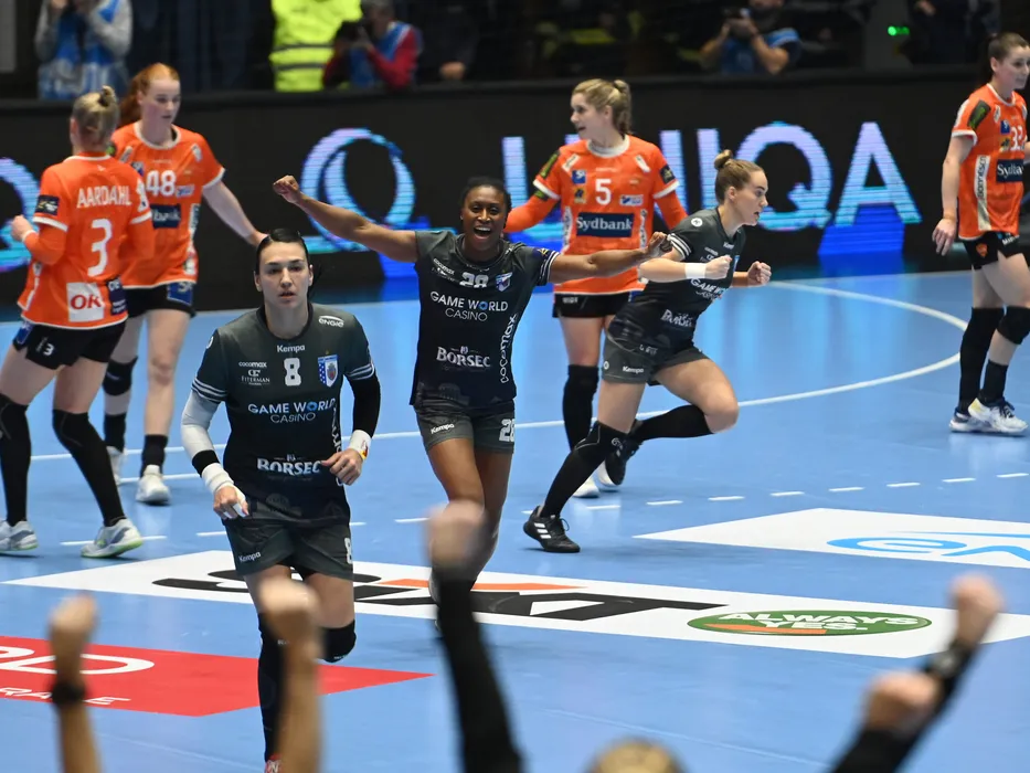 Siraba Dembele Pavlovic se bucura dupa un gol marcat alaturi de Cristina Georgiana Neagu in meciul de handbal feminin dintre CSM Bucuresti si Odense Handbold, contand pentru Liga Campionilor, desfasurat in Sala Polivalenta-Ioan Kunst Ghermanescu din Bucuresti, sambata 14 ianuarie 2023. © FOTO:Razvan Pasarica/SPORT PICTURES