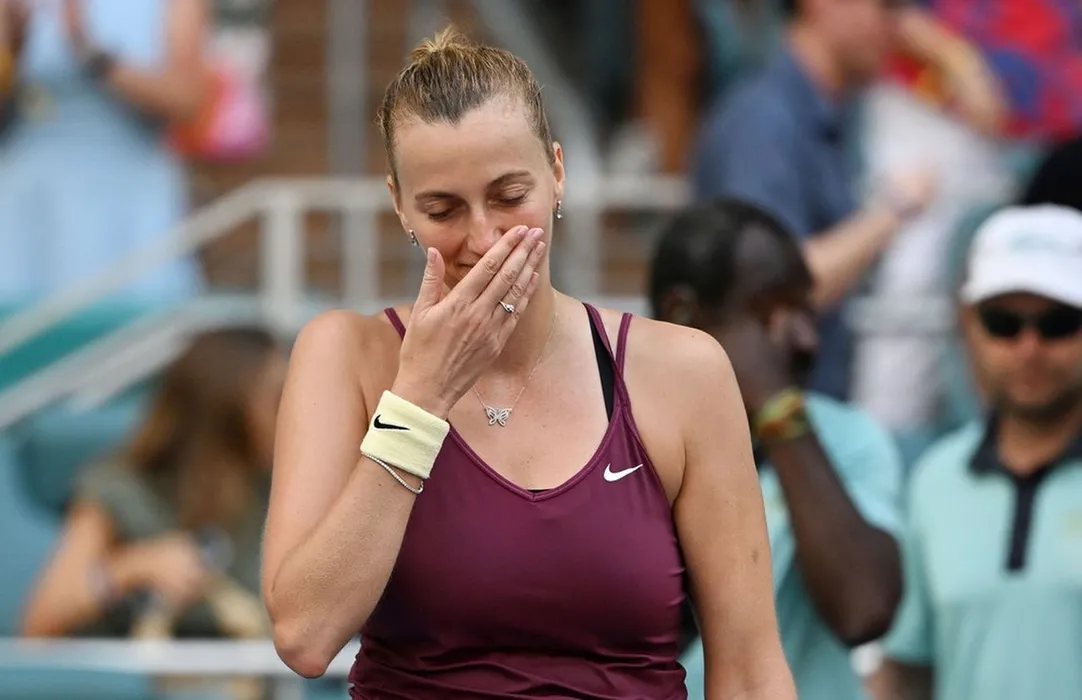 MIAMI GARDENS FL - APRIL 01: Petra Kvitova reacts during match point after defeating Elena Rybakina during the Women's Finals at the 2023 Miami Open at Hard Rock Stadium on April 1, 2023 in Miami Gardens, Florida.,Image: 766704694, License: Rights-managed, Restrictions: **Not for sale in: USA, Brazil, Mexico**, Model Release: no