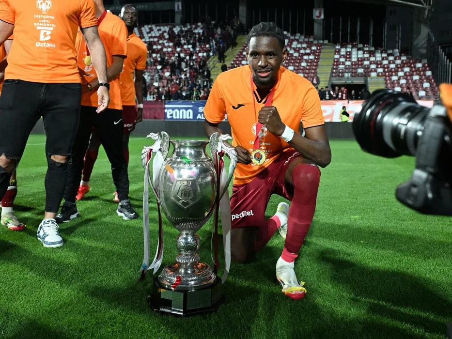 Beni Jean Luc Nkololo pozeaza alături de trofeu dupa meciul de fotbal dintre CFR Cluj si FC Hermannstadt, finala Cupei Romaniei Betano, desfasurat pe Stadionul Francisc Neuman din Arad, miercuri 14 mai 2025. © FOTO:Razvan Pasarica/SPORT PICTURES