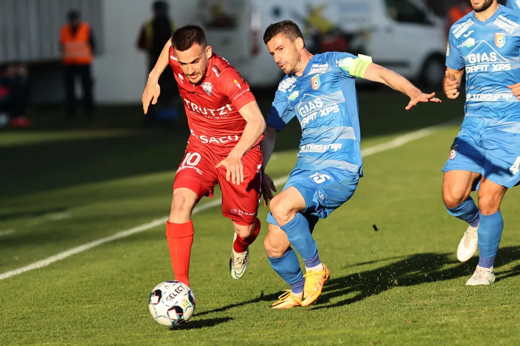 Andrei Tircoveanu si Cornel Dinu isi disputa posesia balonului in timpul partidei dintre Chindia Targoviste si FC Botosani, partida disputata in etapa a cincea din play-out-ul Ligii 1 de fotbal, vineri, 15 aprilie 2022, la Ploiesti. GEORGE FLUSTER / MEDIAFAX FOTO